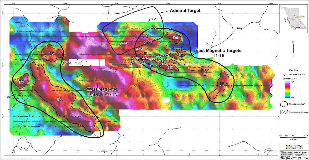 Orestone Mining Corp. (TSX Venture Exchange–Symbol: ORS) (the “Company”) announces that assays have been received from the Company’s 2019 drilling program at the Captain gold - copper project in north central B.C. A total of 1900 metres of drilling in 7 holes was completed in the Admiral Target and target T2, one of 9 large strong magnetic anomalies outlined at the Captain project.