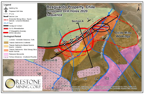 Hole RE-20-003 is located within a mapped area of sericite-silica-clay alteration and elevated surface copper oxide values just east of a strong NW trending linear and west of Section Line 2 (offset to a historic 22 metre drill intercept of manto style mineralization grading 0.495 copper).
