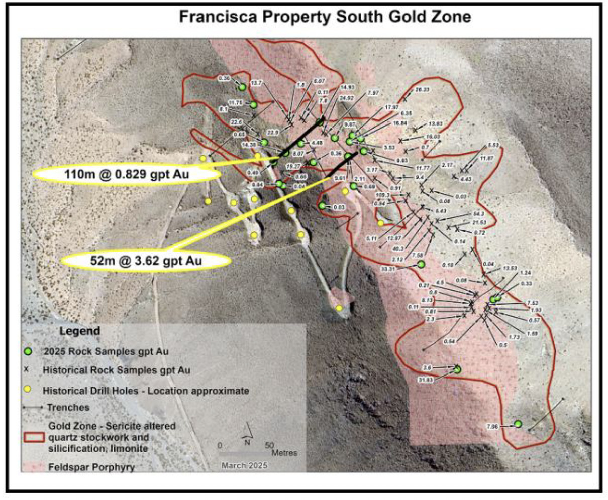 David Hottman, Orestone’s CEO, stated: “The Francisca property covers a robust gold system discovered during a period of historically very low gold prices, which has seen no meaningful work conducted on it for almost 20 years. Results of the current sampling program correlates well with data from the historic work. Our goal is to define an oxide gold deposit that can be mined by open pit and would be amenable to low-cost heap leach gold recovery methods. Additional information regarding exploration plans will be released in the near future.”