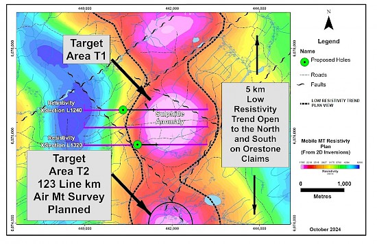 Orestone has filed an amended Notice of Work (NOW) permit for an additional 23 drill locations at the Captain gold-copper porphyry property located in north central British Columbia. The drill locations are on existing logging roads focused on the T2 target area which is a large, although not fully defined target lying to the south of the primary T1 target along the same structural corridor. Drilling is anticipated in the first quarter of 2026. Please click here for additional information.