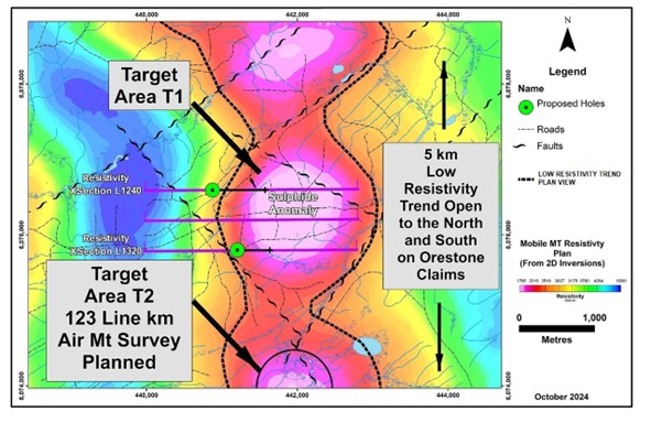 Orestone Mining Corp. (TSXV: ORS) (OTC: ORESF) (Frankfurt: WKN: O2R2) (“the Company”) is pleased to announce that it is planning an airborne MagnetoTelluric (AirMT) survey to cover the partially defined, T-2 conductivity target at the Company’s 100 percent owned Captain Gold Porphyry Project in North Central BC prior to the next drill programe. The project is located 40 kilometres north of Fort St. James and 30 kilometres south of Mt. Milligan, a large open pit copper-gold mine. The T-2 target is the southernmost target zone outlined on the property to date. The Company is obtaining contractor quotes and refining the parameters of the survey at this time. Initially the new survey will consist of 18 lines at 7.2 kilometres in length totalling 157 line kilometres and we expect to complete the program in the summer of 2025.