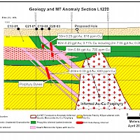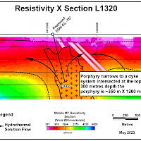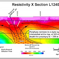 A Magneto Telluric (MT) geophysical survey conducted in the summer of 2021 outlined a large, pronounced low resistivity / high conductivity anomaly over 800 metres in width starting at a depth of 500 metres, extending to a depth of over 900 metres. This conductive body was inferred to be the sulphide rich mineralizing intrusive which altered and mineralized the volcanic section to the west in the area of previous drilling.