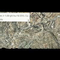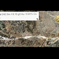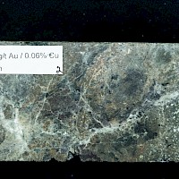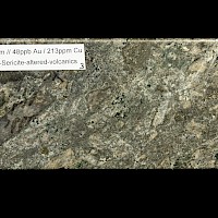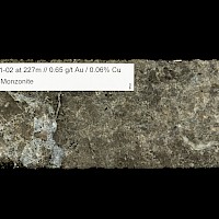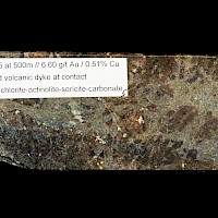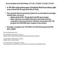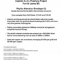 The gold-copper mineralization intersected in diamond drilling in holes C11-01, 13-02, C12-05 and C19-07 at Captain is classic alkali porphyry mineralization and alteration. The alkaline porphyry mineralization in the T1-T2 zone is associated with potassium feldspar magnetite-carbonate-actinolite-chlorite altered volcanics and alkaline porphyry dikes and very fine grained pyrite and chalcopyrite. The presence of magnetite generates strong magnetic responses which guide exploration.