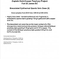 The gold-copper mineralization encountered in drilling to date on the Captain Property varies from longer intersections of lower grade to higher grade over shorter intersections (see table above of previously released assay results).