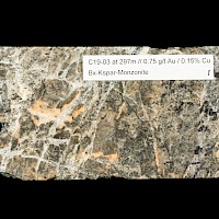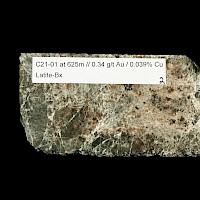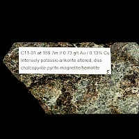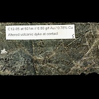In the calc-alkaline porphyry system seen in holes C12-03, C13-03, C19-03 and C20-03, C21-01 and C21-02 alteration and mineralization consists respectively of intense sericite-carbonate-pottassium feldspar alteration with gold-copper associated with fine grained pyrite chalcopyrite sulphides. The calc-alkaline mineralization is associated with a North South striking low resistivity trend coincident with a magnetic low measuring 600 m x 1300m.Two mineralized intrusives have been identified: 1) hypabyssal monzonite associated with the magnetic low with intense sericite-potassium feldspar alteration and 20% disseminated sulphides intersected in hole C19-03 and the inclusion in C13-03 and 2) a feldspar-biotite porphyry on the eastern flank of the magnetic low intersected in C20-03 with strong sericite alteration and potassium feldspar overprint with 2-5 % disseminated sulphides.