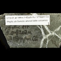 Exploration since 2019, has focused on locating the source of a high grade calc-alkaline potassium feldspar kspar-sericite monzonite porphyry inclusion in a post mineral dyke in drill hole C13-03. This intersection and re-logging of previous drill holes C12-03 and C19-03 confirmed the presence, to the east of a central magnetic high, of a large pottasium feldspar kspar-sericite altered calc-alkaline porphyry system that is co-incident with a magnetic low area measuring 600m by 1300m.