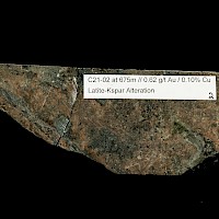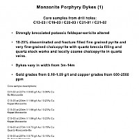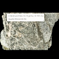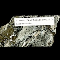 The intersection of a high grade copper-gold calc-alkaline monzonite inclusion in hole C13-03 shifted the focus of exploration toward an area around hole C13-03 and resulted in the discovery of the gold-copper bearing porphyry in drill holes C19-03, C20-03, C20-01, C21-02 which is coincident with a large, 600m by 1300m magnetic low.