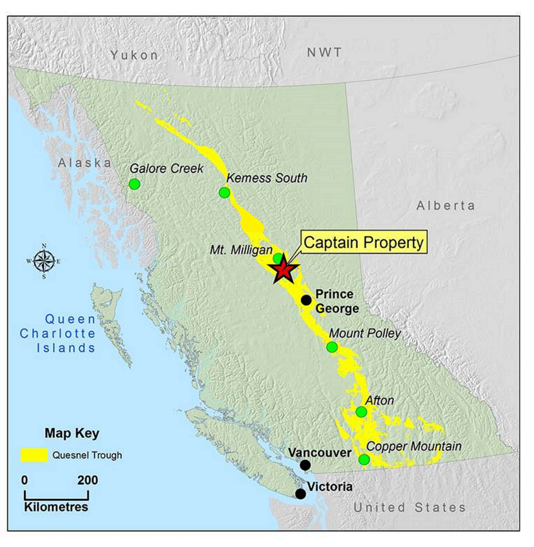The Captain Project lies within the geological terrane of the Quesnel Trough stretching from the US border to the Yukon border which is a 1500 kilometre-long Triassic to Jurassic aged island arc sequence. The Quesnel Trough is a 1,500 kilometer-long, . Age of mineralization in the belt is 150-230 million years. Captain sits in a back arc sequence where mineralization and porphyry intrusions are covered by volcanic and sedimentary rocks and later glacial cover making exploration difficult. This belt has been described as one of the most prospective geological areas for gold and copper within Canada.