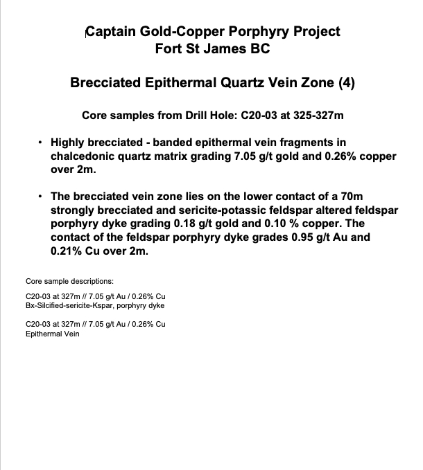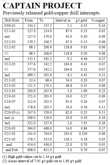 The gold-copper mineralization encountered in drilling to date on the Captain Property varies from longer intersections of lower grade to higher grade over shorter intersections (see table above of previously released assay results).