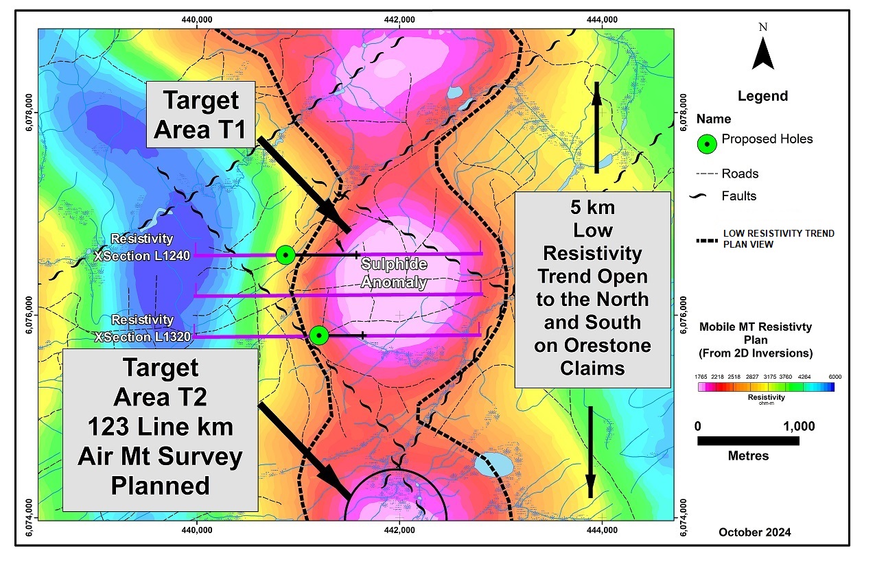 The T1 target is one of three distinct (MobileMT) low resistivity, high conductivity targets outlined over a five kilometre strike length along a prominent north-south trending inferred regional fault on the margin of a large diorite intrusive. All three of the he low resistivity targets along the trend are also associated with magnetic lows with this trend remaining open to the north and south on Orestone claims (see Mobile MT Resistivity plan map.