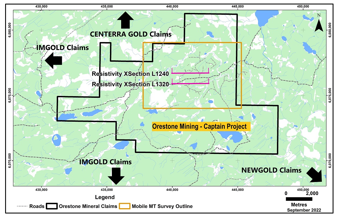 The MobileMT survey confirmed and better defined the large gold dominant porphyry T1 target that is the subject of ongoing exploration by the Company. The T1 target is one of three distinct low resistivity (high conductivity) zones within a prominent five kilometre long trend outlined on the Captain Project located near Fort St. James, North Central, British Columbia. The MobileMT survey was very successful in defining the outline of the low resistivity zone associated with the sulphide related gold-copper mineralization initially identified by Induced Polarization (IP) and magnetic geophysical surveys, and drilling from 2011-2021.