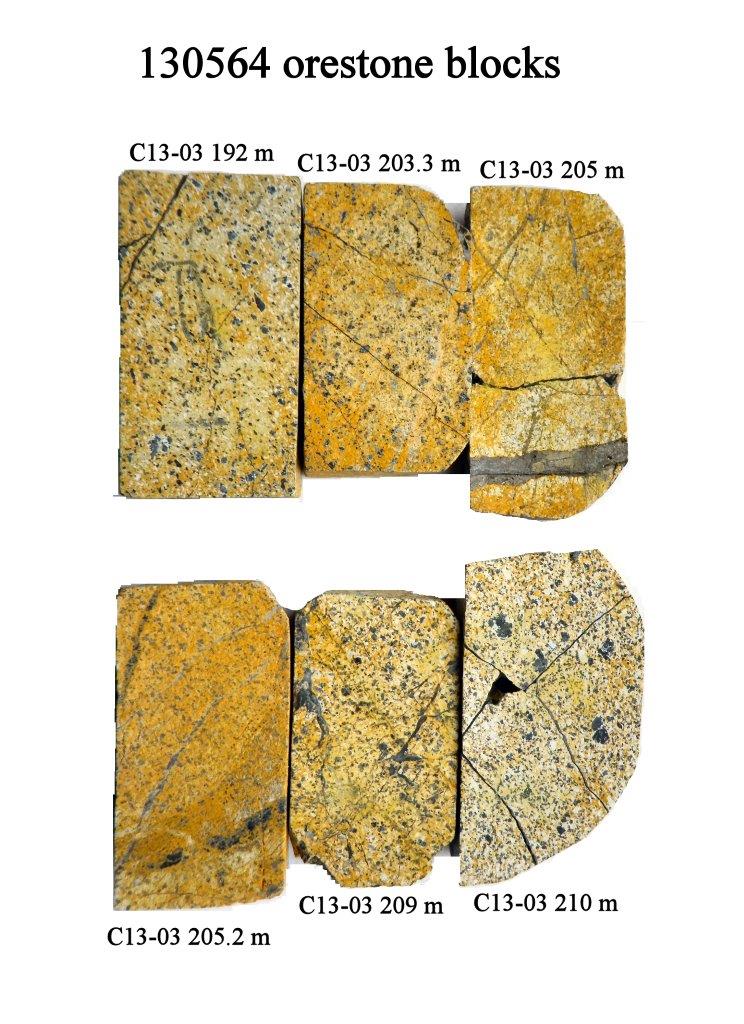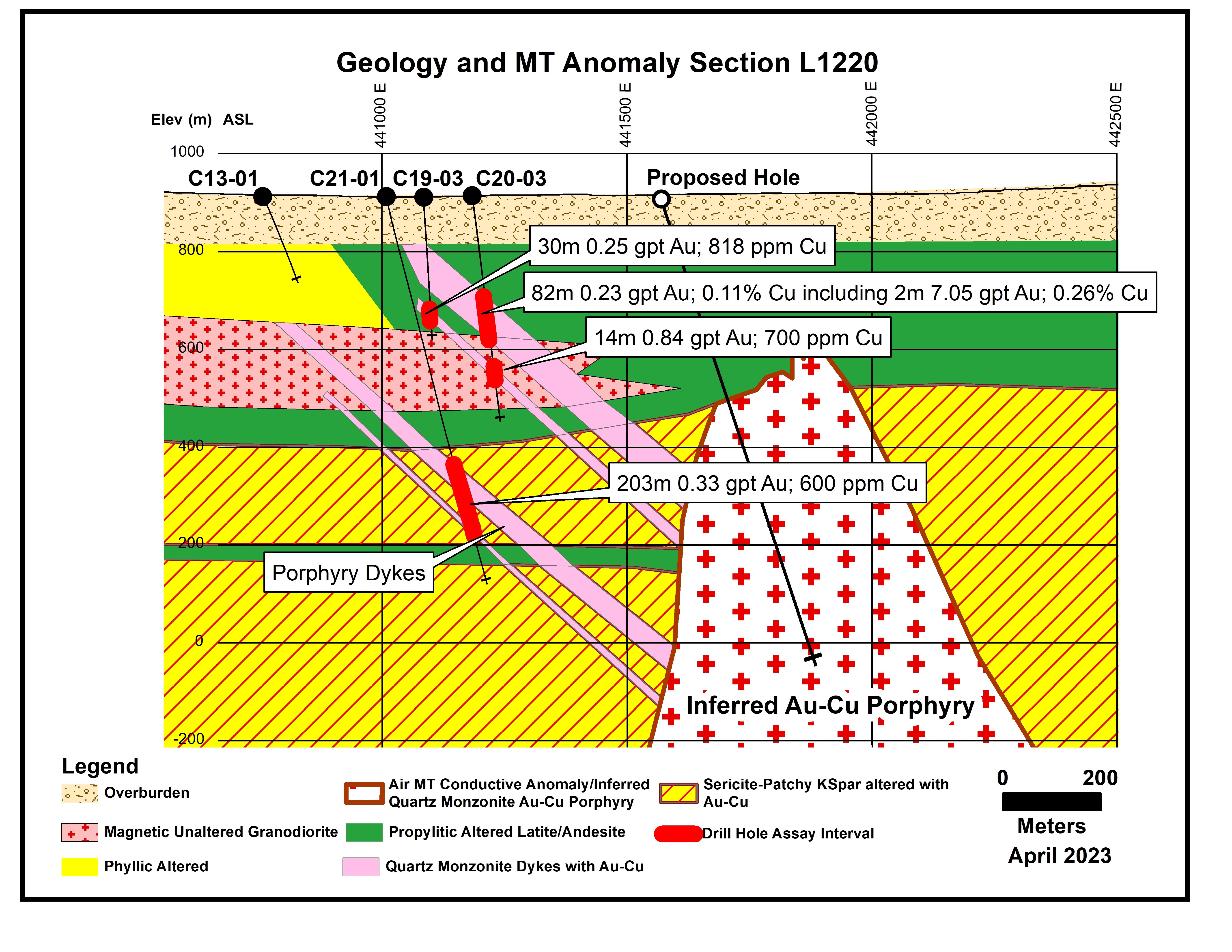 The intersection of a high grade copper-gold calc-alkaline monzonite inclusion in hole C13-03 shifted the focus of exploration toward an area around hole C13-03 and resulted in the discovery of the gold-copper bearing porphyry in drill holes C19-03, C20-03, C20-01, C21-02 which is coincident with a large, 600m by 1300m magnetic low.