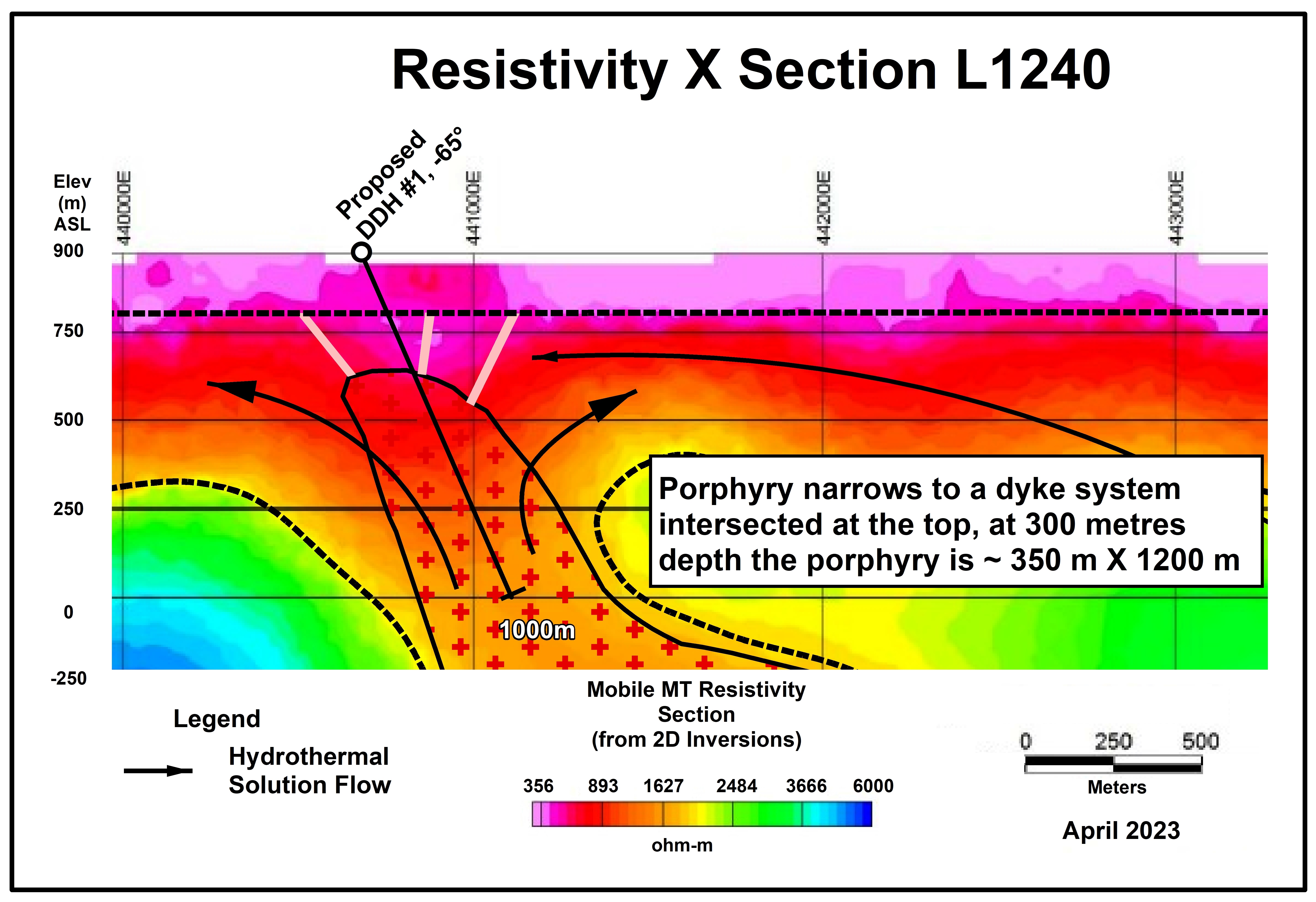 A Magneto Telluric (MT) geophysical survey conducted in the summer of 2021 outlined a large, pronounced low resistivity / high conductivity anomaly over 800 metres in width starting at a depth of 500 metres, extending to a depth of over 900 metres. This conductive body was inferred to be the sulphide rich mineralizing intrusive which altered and mineralized the volcanic section to the west in the area of previous drilling.