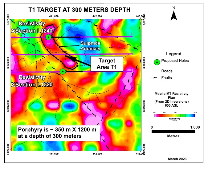The central low resistivity (high conductivity) zone T1 target is untested by drilling to date and lies in the centre of a large scale alteration halo measuring 2000 by 2000 metres. The core of the T1 low resistivity anomaly measures 500 x 1000 metres at a depth of 900 metres below surface increasing in size to 1500 x 1500 metres over a 1000 metre vertical profile and remains open below a depth of 1900 metres.