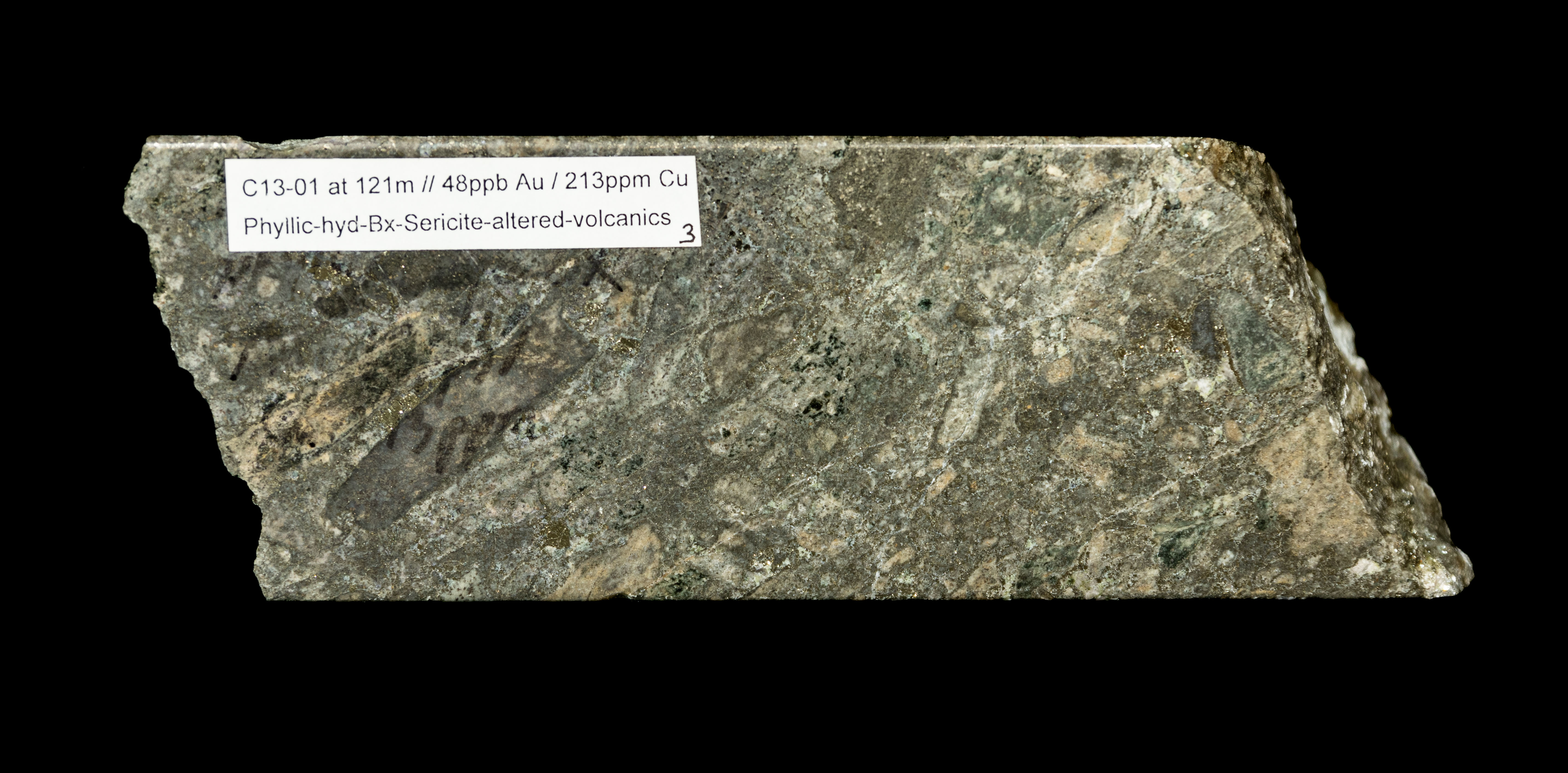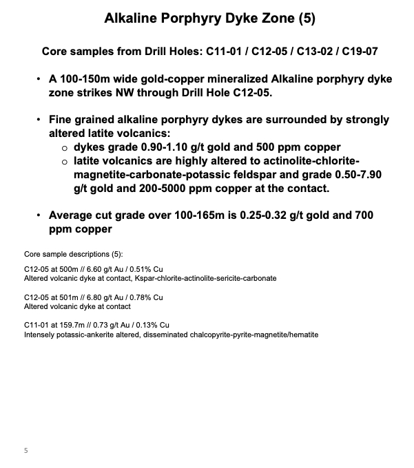 In the calc-alkaline porphyry system seen in holes C12-03, C13-03, C19-03 and C20-03, C21-01 and C21-02 alteration and mineralization consists respectively of intense sericite-carbonate-pottassium feldspar alteration with gold-copper associated with fine grained pyrite chalcopyrite sulphides. The calc-alkaline mineralization is associated with a North South striking low resistivity trend coincident with a magnetic low measuring 600 m x 1300m.Two mineralized intrusives have been identified: 1) hypabyssal monzonite associated with the magnetic low with intense sericite-potassium feldspar alteration and 20% disseminated sulphides intersected in hole C19-03 and the inclusion in C13-03 and 2) a feldspar-biotite porphyry on the eastern flank of the magnetic low intersected in C20-03 with strong sericite alteration and potassium feldspar overprint with 2-5 % disseminated sulphides.