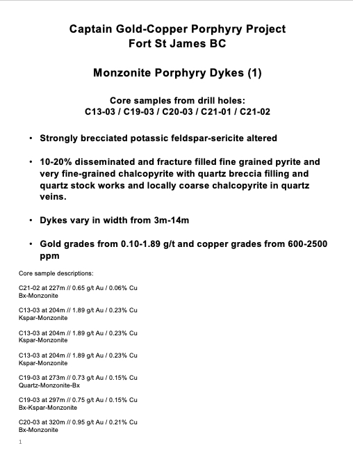Early exploration focused on anomalies within the eastern and western magnetic highs which were thought to represent gold-copper mineralization associated with highly altered volcanics and alkaline porphyry dykes and intrusives. This mineralization is similar to the Mt. Milligan gold-copper mine located 30 km to the north of the Captain