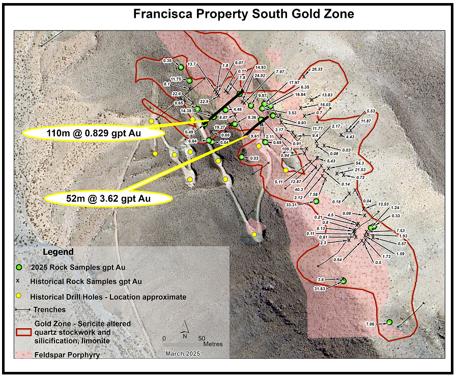 High grade intervals of gold are noted in historic summary reports and on trench maps over widths of 3 to 14 metres with grades from 1 to 109 g/t gold. Summaries of trenching data across the South zone are noted to have gold assay intervals of 52 metres grading 3.65 g/t gold with 17.88 g/t silver in trench TZ1 and 110 metres grading 0.82 g/t gold with 7.33 g/t silver in trench TZ2. The mineralization in both trenches remains open, indicating the potential for expansion. Mansfield noted that the high-grade intervals are hosted within a broad zone of lower grade material but only the higher-grade zones were described.