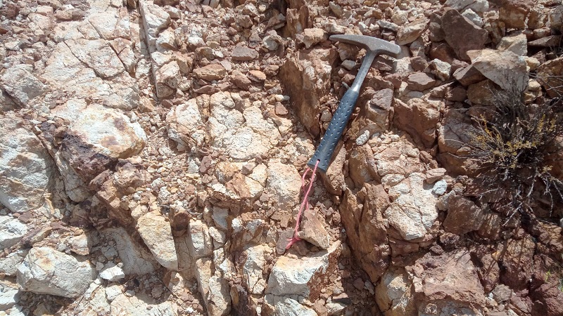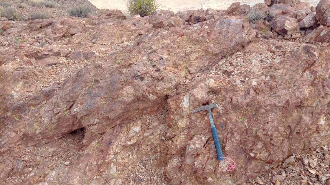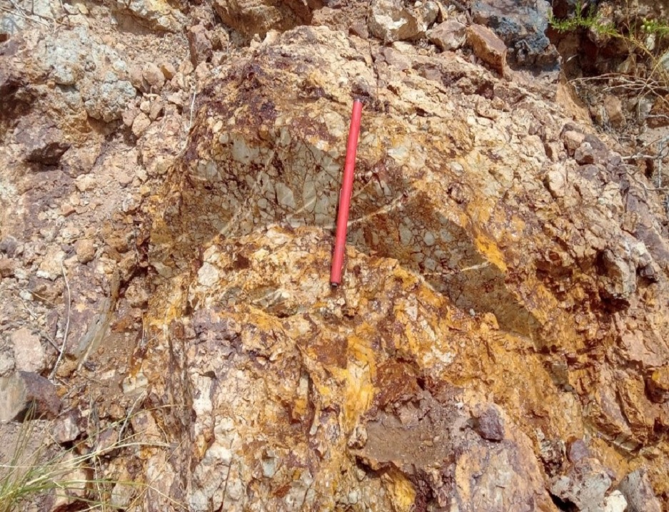 Geologic mapping has outlined an oxide gold stock-work mineralized trend along a northwest strike length of 1100 metres outcropping on the crest of a moderate relief hill. Two gold zones have been outlined to date within the trend. The surface expression of the North and South zones each measures 400 to 500 metres in strike length with widths varying from 50-100 metres. The zones are surrounded by a 500 to 1000 metre wide, area of strongly hornfels altered sediments and underlain by a large IP changeability anomaly indicating potential for a larger mineralized intrusive body at depth. The oxide gold quartz limonite stockwork trend is associated with quartz feldspar porphyry intrusive dykes and intense sericite alteration along NW trending faults.